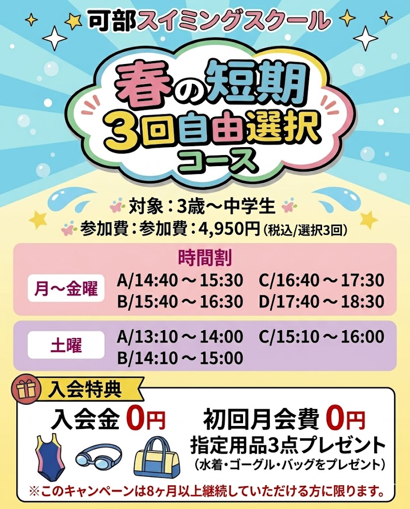 春の短期水泳教室 はじめてのお子さまも大歓迎の短期水泳教室を開催します。スケジュールに合わせて、自由に3回選択できるので、他の習い事や、予定を合わせやすいと大好評!水が苦手なお子さまからレベルアップを目指す方まで、楽しみながら泳力アップ!この春「できた!」を増やしましょう。 詳しくはこちら